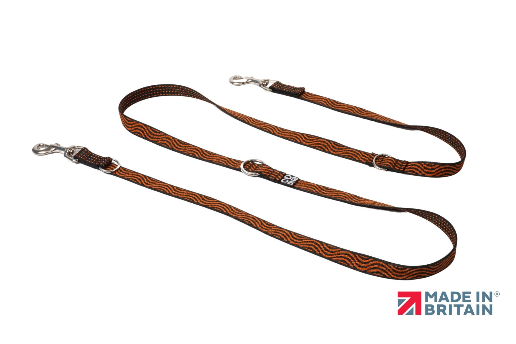 The length of the lead is constructed from UK-woven jacquard, that is adorned with tasteful wave and dot designs. Our Ember Drift design gives a pop of colour, with bright orange patterns along the length.
