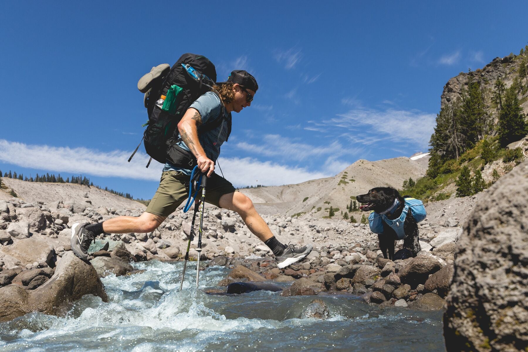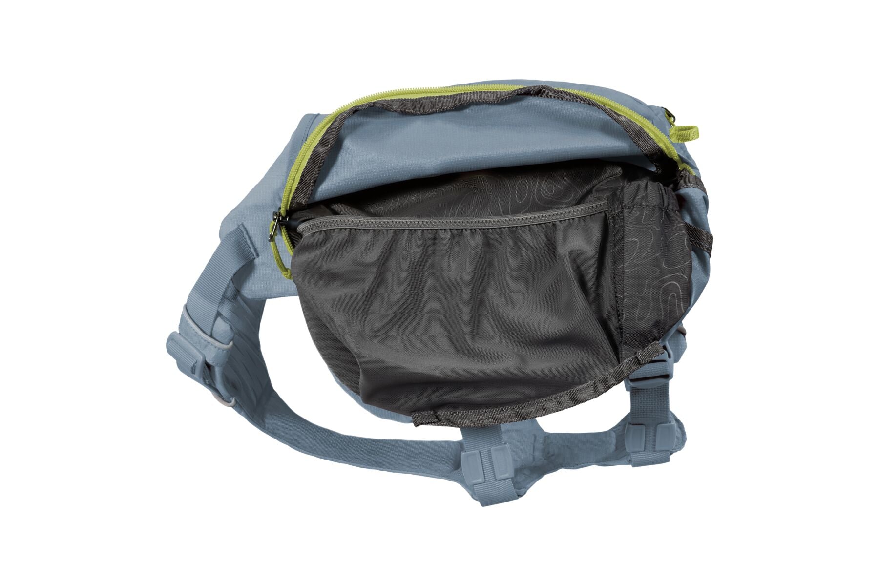 The saddlebags attach securely to a breathable harness chassis, and can be removed at camp to lighten the load for side-excursions. Multiple pockets and an external daisy chain store and organize your dog's trekking necessities like a sleeping system, food, and even two collapsible hydration bladders that come with the pack. Multiple pockets and an external daisy chain store and organise your dog's trekking necessities. Five points of adjustment for an optimal fit.